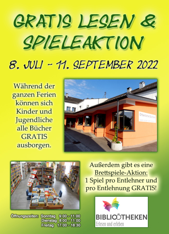 Gratislesen: Während der Ferien (8. Juli bis 11.September 2022) können Kinder und Jugendliche Bücher und Zeitschriften gratis ausborgen. Anfallende Überziehungsgebühren sind zu bezahlen.