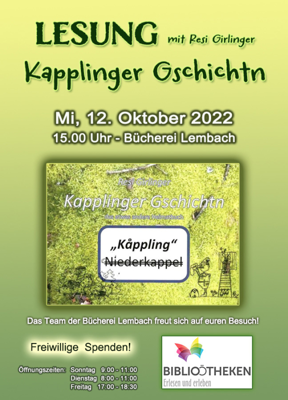 Wir laden sehr herzlich zur Lesung mit Resi Girlinger in der Bücherei ein.