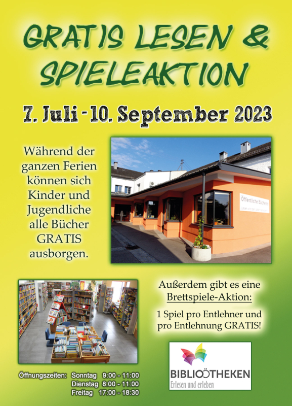Gratislesen: Während der Ferien (7. Juli bis 10.September 2023) können Kinder und Jugendliche Bücher und Zeitschriften gratis ausborgen. Anfallende Überziehungsgebühren sind zu bezahlen.