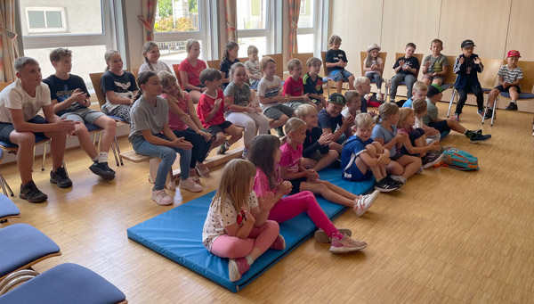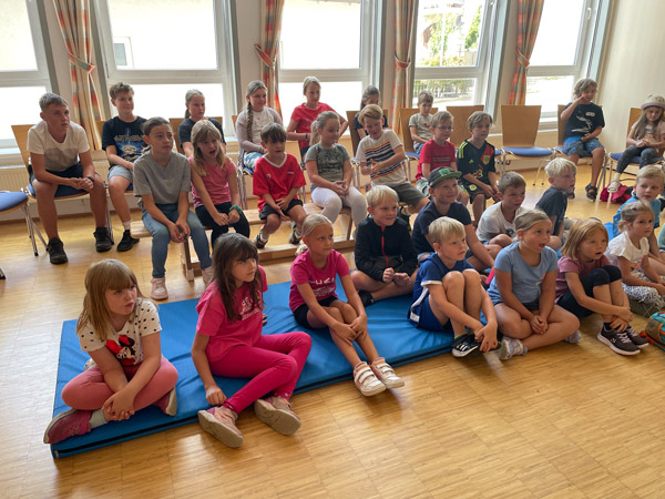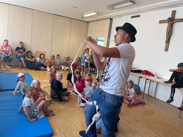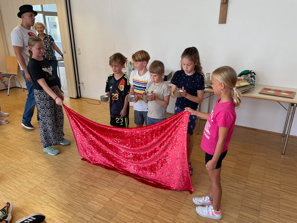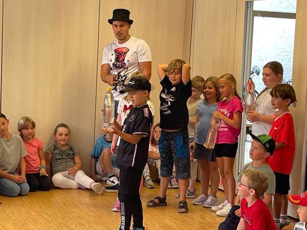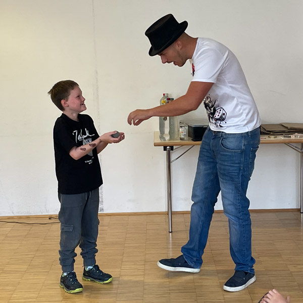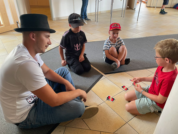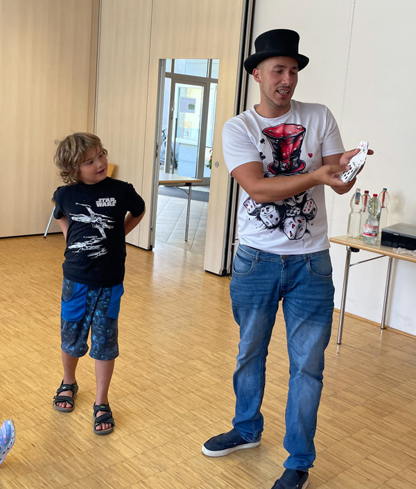 Zauberer Julian verstand es wunderbar, die Kinder mit seinen Tricks in seinen Bann zu ziehen und sie dann in der Zauberschule in die hohe Kunst der Magie einzuweihen. Voll Begeisterung machten die Kinder mit und am Ende des „Unterrichts“ waren alle Kinder bereit, den Eltern bei einer spannenden Vorführung zu zeigen, was sie in der Zauberschule gelernt hatten.