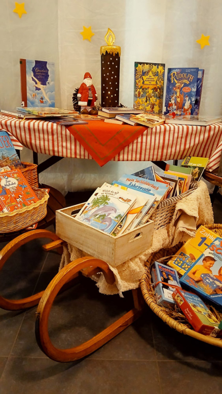 Wie jeden Advent haben wir viele Romane, Sachbücher, Kinderbücher, Hörbücher, Filme … für Sie im Vorraum unserer Bücherei ausgestellt.